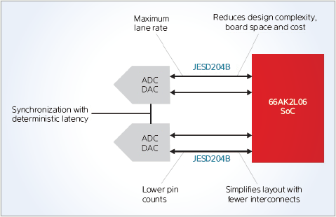 TI는 JESD204B 인터페이스에서 ADC와 DAC의 시스템 요건들을 충족시키기 위해 점점 더 많은 옵션들을 제공함으로써 66AK2L06 SoC와 직접 연결할 수 있게 했다. JESD204B 인터페이스에서의 ADC는 50Msps부터 4Gsps까지의 샘플 레이트와 12비트부터 16비트까지의 해상도를 제공한다. 더 높은 샘플링 레이트를 가진 디바이스에는 종종 샘플 레이트를 떨어뜨릴 수 있는 구성형 우회 데시메이션이 포함되기도 한다.