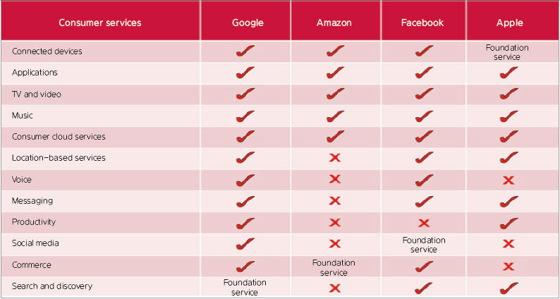 구글은 검색 엔진을, 아마존은 인터넷 커머스를, 페이북은 소셜미디어를, 그리고 애플은 서비스가 아닌 커넥티드 디바이스를 제공한 사업자였으며, 현재 아마존을 제외한 다른 3개 기업은 메시징 서비스를 제공 중이다. OTT 메시징 역량을 조기 확보할 수 없다고 판단한 페이스북은 왓츠앱을 인수했다.