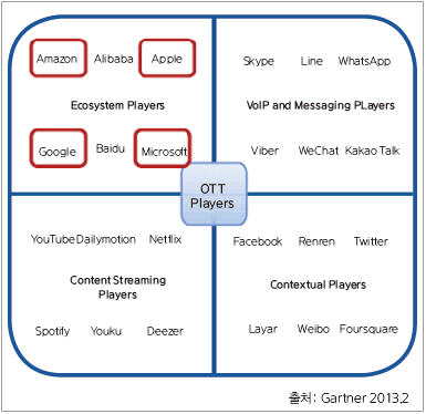 전 세계적으로 모바일 온리 시대가 도래하면서 <그림 1>의 주요 기업 외에도 다양한 장르에서 OTT 콘텐츠 기업군들이 등장한다. <그림 2>에서 나타나듯이, 2013년 현재 OTT 콘텐츠 서비스 포트폴리오를 넓게 가진 기업들을 생태계 기업들(Ecosystem players)이라 부르기 시작했고, 장르별로 서비스를 제공하는 기업들을 각 장르에 따라 VoIP/메시징 기업, 콘텐츠 스트리밍 기업, 컨텍스트 기업 등으로 부르기 시작했다. 이들 모두는 ‘OTT 콘텐츠’를 제공하는 기업들이며 그 중에서 스트리밍은 동영상 제공 기업을 말한다.