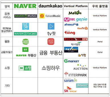 즉, 버티컬 플랫폼이란 특정한 분야에 관심을 가지고 있는 이용자들을 대상으로 전문 장르인 음악, 동영상, 게임, 쇼핑, 뉴스, 교육 등 세부 분야로 나누어 한 분야에 대해 서비스를 제공하거나 검색, 커머스, 커뮤니티 등 기능 중 하나를 선택하여 집중적으로 서비스하는 방식이다. 이에 비해, 호리즌탈 플랫폼은 네이버나 카카오처럼 다양한 서비스를 제공하는 사업자를 말한다. 버티컬 플랫폼은 호리즌탈 플랫폼보다 더 깊이 있는 정보 및 서비스를 제공한다고 말할 수 있겠다.