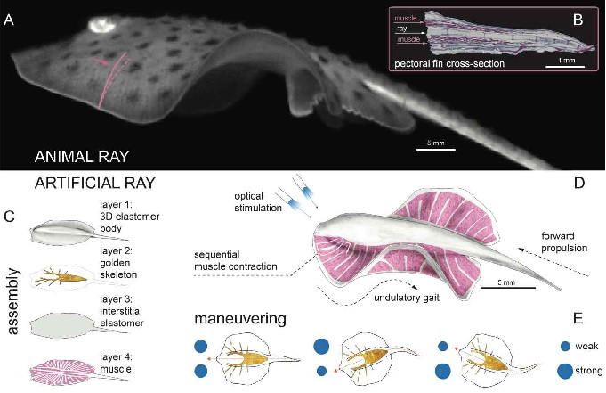 이번에 개발된 바이오 로봇은 생체세포와 무기물이 결합한 가오리 형태의 로봇으로 내부의 동력기관 없이 물속에서 유영이 가능하다. 빛의 자극에 반응하도록 조작한 세포를 로봇의 뼈대에 근육조직으로 배양하고, 근육이 빛의 빈도 등에 따라 수축-이완하게 함으로써 로봇이 움직이는 원리이다. 배양세포로는 쥐의 심근세포를 이용하였으며, 바이오 로봇의 근육 구조와 물속에서 유영하는 움직임은 실제 가오리와도 유사하다.