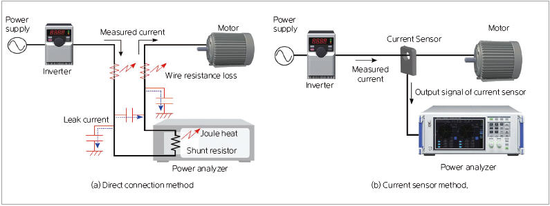 전류센서 방식은 측정대상의 배선에 전류센서를 연결하고 센서의 출력신호(전류 또는 전압)를 파워 아날라이저에 입력해 전류를 측정하는 방식이다. 전류센서방식의 경우, 측정 시 측정대상의 상태가 실제 가동상태와 동일하며, 대전류 측정 시 자기가열도 아주 적기 때문에 측정 정확도에 영향을 미치지 않는다.