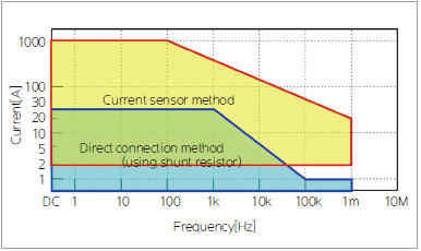 그림 2는 직접결선방식과 전류센서방식에서 각각 고정밀도로 측정 가능한 전류값의 범위와 주파수대역이다. 참고로 도표 안 범위에서 벗어난다고 해서 반드시 두 방법에서 측정이 불가능하다는 의미는 아니므로 주의해야 한다. 전류센서방식으로 고정밀도 전력측정을 하기 위해서는 앞서 언급한 바와 같이, 5A가 넘는 전류는 전류센서방식으로 측정하는 것이 일반적이다.