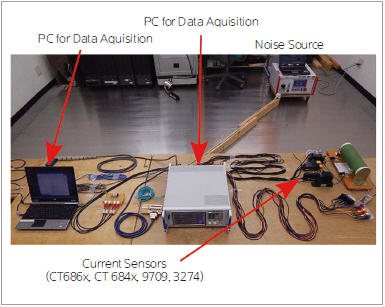 그림 5는 회사의 전류센서 (CT6862, CT6863, 9709, CT6841, CT6843, 3274)와 파워 아날라이저(PW6001)를 조합한 전력측정 시스템의 Immunity test를 제3자 인증기관에서 실제로 실시했을 때의 모습이다.