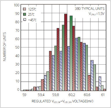 오차 증폭기의 낮은 오프셋으로 제어 루프는 20분의 1 아날로그 디밍에서 ±10%의 일반적인 정확도를 달성할 수 있다. 제어 입력이 1.5V일 때 LED 전류 감지 핀에 걸친 레귤레이트된 전압의 분포는 그림 2에서 볼 수 있다. 전체 범위의 오차는 ±3%를 벗어나지 않으며, 이는 60mV 풀스케일 레귤레이션 전압에서 ±1.8mV에 해당한다.
