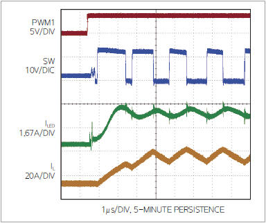 LED 드라이버 성능에서 가장 중요한 지표의 하나는 PWM 디밍 시 LED 전류의 회복에 있다. 최종 제품의 품질은 PWM 턴온 신호의 상승 에지 후 처음 몇 회의 스위칭 사이클에서 보여주는 드라이버의 특성에 크게 결정된다. LT3744는 리니어 고유의 PWM, 보상 및 클록 동기화 기술을 사용해 LED를 20A로 구동할 때도 깜빡임 없는 성능을 제공한다.