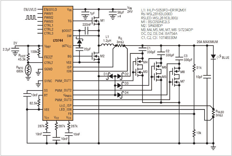 최신 전력 MOSFET을 통합한 효율적인 고전류 LED 드라이버 컨트롤러는 약 4cm²의 솔루션 크기로 약 200W를 제공하며, 모든 전력 경로 부품 온도를 80℃ 미만으로 제한할 수 있다. 200W보다 높은 LED 부하의 경우 LT3744를 다른 LT3744와 병렬로 연결해 특정 부품에서 온도 상승을 제한할 수 있다. 모든 보상 출력은 각 레귤레이터 사이에서 전류를 공유할 수 있도록 병렬로 배치해야 한다.