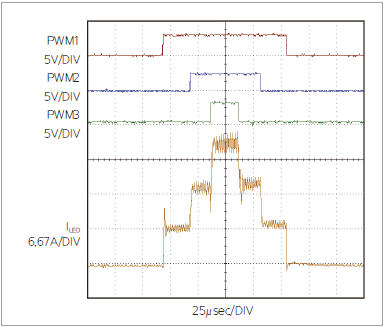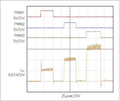 세가지 다른 전류 상태 간의 PWM 디밍은 그림 5와 그림 6에서 볼 수 있다. 그림 5에서 PWM 신호는 순차적으로 턴 온/오프 된다.