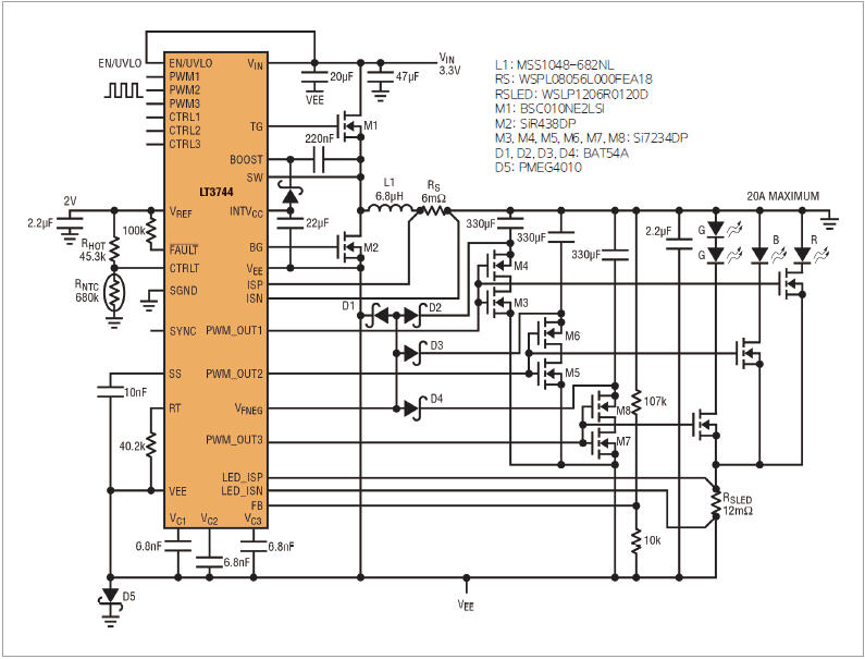 각 LED는 LED 간 시간 지연을 갖거나 PWM 디지털 입력에 임의 패턴 입력을 가지면서 순차적 턴온 할 수 있다. 또한 각 LED는 3개의 독립 아날로그 제어 입력을 가지므로 서로 다른 레귤레이트된 전류로 동작할 수 있다. LT3744를 반전 벅-부스트로 구성할 경우 단일 리튬 이온 배터리로 단 하나의 컨트롤러를 사용하여 3개의 독립 LED 스트링을 구동할 수 있다. 그림 7은 특별히 RGB 포켓 프로젝터에 적합하도록 설계된 3.3V/5A 반전 3컬러 벅-부스트 LED 드라이버를 보여준다.