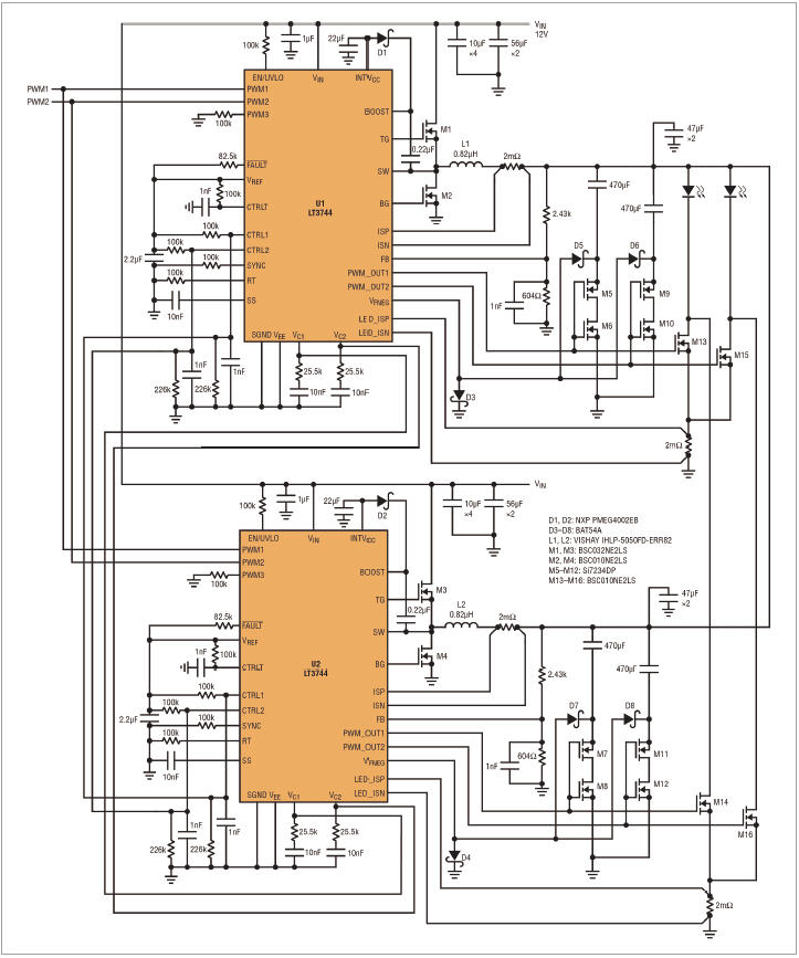2개의 병렬 LT3744 LED 드라이버를 사용하는 324W 2-LED 드라이버