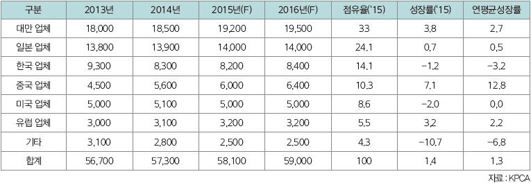업체별 생산 순위는 대만 업체(33%) 일본 업체(24.1%), 한국 업체(14.1%), 중국 업체(10.3%) 순으로 조사됐다. 한국 업체들의 생산 규모는 82억 달러로 집계됐으나, 유일하게 다른 나라와 달리 마이너스 성장률인 것으로 나타났다. 반면, 중국 업체들의 성장률이 두드러졌다. 중국 업체들의 생산 규모는 60억 달러였으나, 12.8%의 연평균성장률을 보였다.(표 2)
