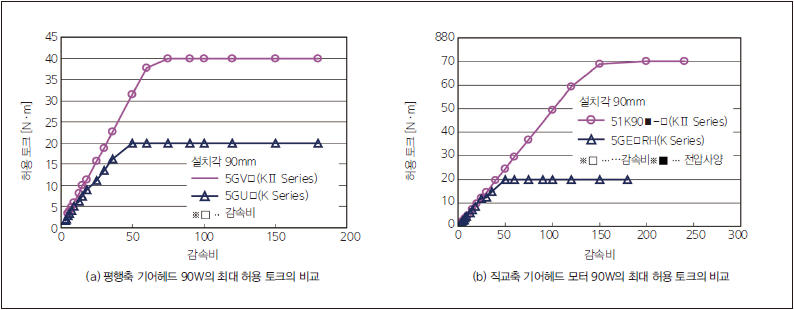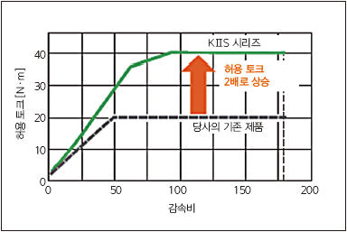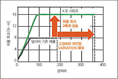 ‘KⅡ·KⅡS 시리즈’는 모터의 토크를 극대화하기 위해 기어헤드의 강도를 높인 제품이다. 열처리 기술과 담금질 그리고 대구경 베어링을 채용해 허용 토크를 높인 것이다. 허용 토크는 기존 ‘K 시리즈’보다 평행축 기어헤드는 최대 2배, 직교축 기어드 모터는 최대 3.5배 높아졌다. 그림 5와 그림 6은 기존 제품과 ‘KⅡ·KⅡS 시리즈’의 토크 특성 대표 예시로, 최대 허용 토크에 대한 비교를 보여준다.