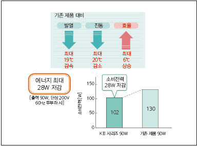‘KⅡ·KⅡS 시리즈’는 입력 전원 사양마다 최적의 특성이 되도록 전용 설계로 변경하여, 모터 소비 전력을 최대 28W 줄였으며, 발열과 진동을 억제하고 고효율을 실현했다(그림 4).