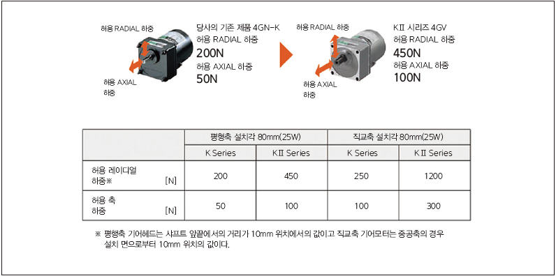 또한, ‘KⅡ·KⅡS 시리즈’는 허용 레이디얼 하중과 축 하중의 허용치를 높였기 때문에, 현재 사용 중인 모터를 ‘KⅡ·KⅡS 시리즈’로 변경하면 모터의 소형화가 가능하다(일부 형번 제외). 그림 7은 25W의 허용 레이디얼 하중과 허용 축 하중이다.