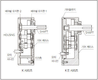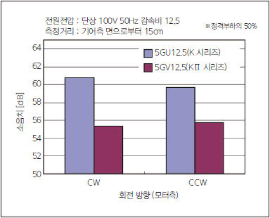 평행축 기어헤드의 구조는 그림 9와 같다. ‘K 시리즈’는 베어링 유지판과 유지판을 고정하는 하우징(HOUSING)으로 베어링을 고정하고 있었다. 반면, ‘KⅡ·KⅡS 시리즈’는 베어링 유지판과 하우징을 없애고 기어 케이스와 기어 플랜지에 베어링을 직접 고정하는 구조로 되어있어, 베어링의 대구경화가 가능하다. 또한, 기어 표면 마무리 작업을 통해 ‘K 시리즈’보다 최대 6dB의 낮은 저음화를 실현했다. 그림 10은 ‘K 시리즈’와 ‘KⅡ 시리즈’의 90W, 감속비 1·12.5 소음 값 비교 자료다.