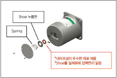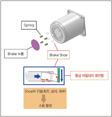 Brake Shoe로 상시 압력을 가해 움직이게 하고 있으며, 마모량은 거의 변화를 보이지 않는다. 그림 11과 12에서 알 수 있듯, 기존 방식과 다르게 Brake Shoe 구조를 일체화 설계해 누름 진동이 감소하고, 마찰음도 감소했다.