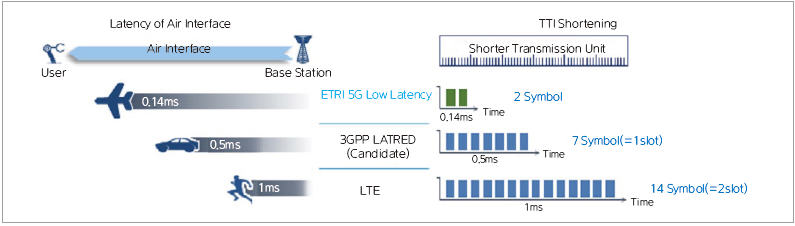 이번에 개발에 성공한 5G 저지연 이동통신 기술은 저지연 전송에 적합하도록 데이터 전송 단위를 기존 1ms 주기였던 4G LTE 방식 대비 1/7 수준(143㎲)으로 감소시켜 단말에서 기지국까지의 무선 구간에서 데이터 전송 주기를 단축시킴으로써 신속하게 데이터를 전송하는 ‘TTI 단축(Transmission Time Interval Shortening, 전송시간주기)’ 기술이 핵심이라고 할 수 있다. 또한, 기존의 4G용 단말과 5G 저지연 단말을 동시에 수용할 수 있는 ‘역호환 무선 프레임(Backward-compatible Radio Frame) 구조’, 수신 데이터 인식 시간을 최소화하는 ‘고속 채널 추정 및 디코딩(On-the-fly 개념)’ 기술, 제어 신호와 참조 신호를 최적으로 배치하는 ‘오버헤드 최소화 신호 설계’ 기술 등도 핵심 기술에 포함된다.