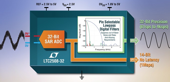 리니어에 따르면, LTC2508-32는 32비트 저잡음의 디지털 필터 출력과 14비트 1Msps 의 지연 없는 출력을 동시에 제공해 하이브리드 ADC 시스템을 간소화시킨다. 출력은 32비트 단일 SAR ADC 코어에서 생성되기 때문에, 고정밀과 고속 출력이 제공된다.