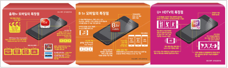 2016년 현재 한국 유료TV들은 거의 모두 N스크린을 제공 중이다. IPTV만 예로 들면 <그림 7>과 같다. 2011년 5월에 KT가 올레티비모바일(olleh tv mobile)을 먼저 시작했고, SK브로드밴드가 비티비모바일(Btv mobile), LG U+가 유플러스HD티비(U+ HDTV)라는 이름으로 서비스하기 시작했다.