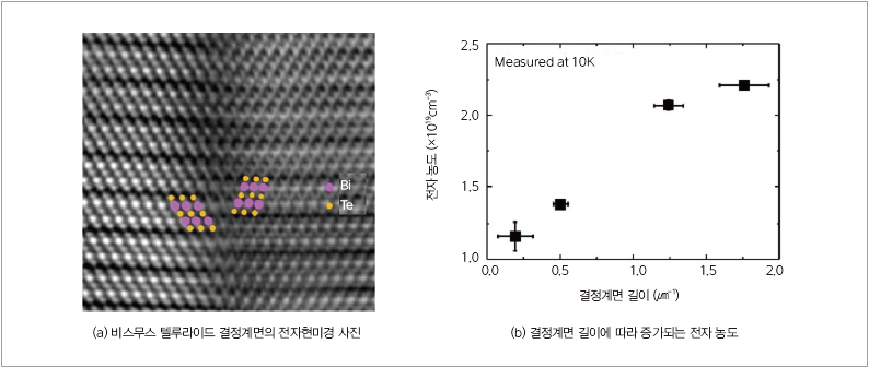 연구진은 비스무스 텔루라이드 열전 반도체에 존재하는 결정립계면(Grain Boundary)에서 자유전자가 생성된다는 사실을 발견하고, 이에 대한 물리적 원인을 제시했다.