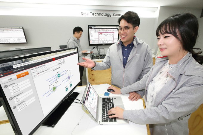 ▲KT 직원들이 우면동 KT 융합기술원에서 NFV 라이선스 관리 기술을 이용해 가상으로 신규 장비를 추가하는 모습/ⓒKT