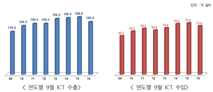 산업통상자원부는 2016년 9월 정보통신기술 부문 수출과 수입 실적을 13일 발표했다. 자료에 따르면 ICT 총 수출은 145억 3천만 달러, 수입은 73억 4천만 달러를 기록, 무역수지는 71억 9천만 달러 흑자에 이른 것으로 잠정 집계됐다.