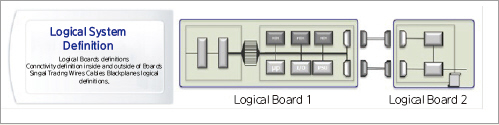 시스템 정의 능력을 통해 시스템 디자이너는 시스템 엔지니어의 설계 의도를 시각화 및 구현하고, 시스템 전체에 걸쳐 최적의 기능 위치와 인터커넥티비티를 생성할 수 있다. 시스템 정의의 핵심 요소는 논리적 보드이다. 디자이너는 단지 시스템 레벨의 블록과 온보드 커넥터들을 그룹화 하는 것만으로 논리적 시스템 뷰 레벨에서 논리적 보드를 정의한다(그림 4 참조). 이 프로세스는 간단하고 매우 직관적이다. 디자이너는 단순히 시스템 레벨의 블록을 이용해 시스템 기능을 분할하는데, 이 블록은 PCB 설계 후반에서 일반 계층적 블록의 역할을 하게 된다. 디자이너는 시스템 레벨의 블록을 로컬에서 생성하여 기업 라이브러리로부터 배치하거나 혹은 기존의 PCB 설계 부분들을 재사용할 수 있다(그림 5 참조).