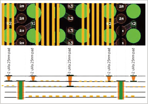이를 어떻게 완성하는가를 이해하기 위해선 HDI 스택업과 정렬-변경된 블라인드 바이어스를 면멸히 관찰해야 한다. 그림 7에서 보다 자세한 사항을 확인할 수 있다. FPGA 핀 2개 열을 레이어 3으로 팬 아웃시키고 (50옴의 싱글 엔드 Rocket I/O에 대해 스킵 바이어스를 사용 다음 두 개 열을 레이어 2에 팬 아웃시킨 후 레이어 5에 있는 매립 바이어스로 떨어뜨린다(100옴 차등 페어 I/O). 이러한 배열을 통해 매립 바이어스간 통로가 장비 피치보다 네 배 커지게 된다. 이 통로의 폭은 4.0mm이며 최대 13개 경로 구성이 가능하게 된다 - 전역 경로 구성에 있어 상당히 큰 자유 경로가 된다. 레이어 5를 사용하면, BGA는 대규모 경로에 대해 바이어스로 정렬된 경로를 생성하는 매립 바이어스만 있기 때문에 사라진다.
