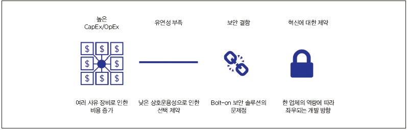 또한, SDA의 가상화된 기능 측면 덕분에 통신 분야의 NFV와 마찬가지로 동급 최상의 네트워크 보안 기능(및 산업 자동화 보안 기능)을 쉽고 비용 효율적으로 시스템에 도입할 수 있다. 이러한 기능에는 방화벽, VPN concentrator, IDS(침입 탐지 시스템)/IPS(침입 방지 시스템), SIEM, 그리고 아직 개발되지 않은 보안 기능까지 포함된다.