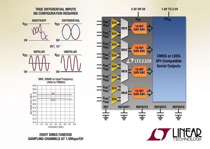 LTC2320-16은 채널당 최대 5Msps의 샘플링 레이트를 제공하는 싱글, 듀얼, 쿼드 및 옥탈 옵션의 16비트, 14비트, 12비트 SAR ADC 제품군 중에서 가장 선도적인 제품이다. 전체 제품군은 폭넓은 입력 공통모드 범위에 대해 8.192VP-P ~ 10VP-P의 진정한 차동 입력 디지털 신호를 받아들이는데, 입력 신호 유형에 대해 어떠한 구성도 필요 없어 입력 신호 체인에 유연성을 보장한다.