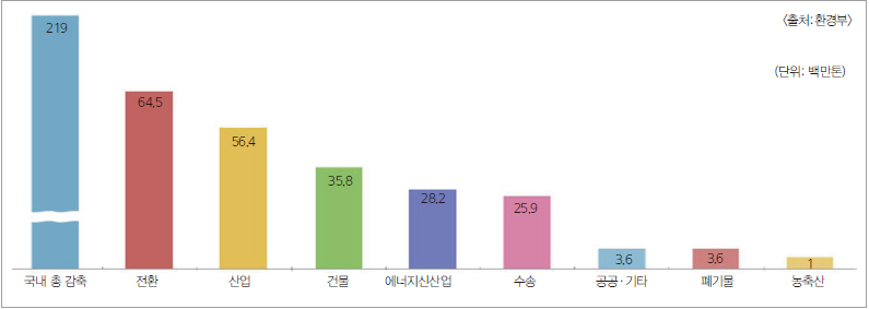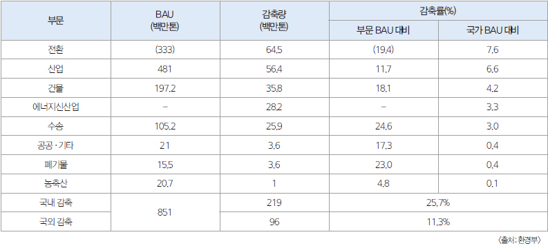 기본로드맵에 따르면 2030년 감축량 315백만톤 중 국내에서는 전환(발전), 산업, 건물 등 8개 부문에서 219백만톤(BAU 대비 25.7%) 감축을 목표로 한다.