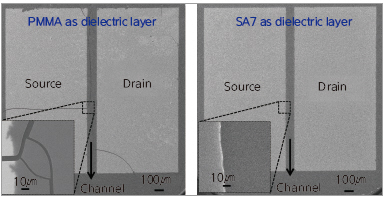 관찰할 수 있다(왼쪽 아래). 반면에 게이트 유전물질로 SA7을 쓴 경우(오른쪽), 열처리