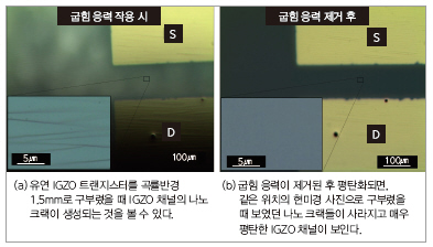 특히, 1.5mm의 곡률 반경으로 구부렸을 때 IGZO 채널에 형성된 나노 주름들이, 박막을 다시 펼쳤을 때 사라지는 복원력을 보여주었다(그림 3). 이렇게 개발된 IGZO 박막 트랜지스터(TFT)는 전자이동도 15.64cm2/Vs, 문턱전압 6.4V, 온오프 전류비 4.5×105의 소자 특성을 나타냈다.