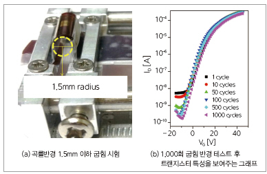 곡률 반경 1.5mm 이하이고 1,000번 이상 휘어져도 작동하는 무기물 기반 트랜지스터를 국내 연구진이 개발했다. 이에 따라 돌돌 말거나 접을 수 있는 스마트 전자기기의 상용화에 크게 기여할 수 있을 것으로 기대되고 있다.