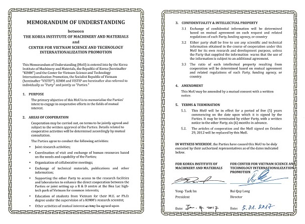 미래창조과학부 산하 한국기계연구원은 베트남 과학기술부 산하 과학기술국제진흥센터와 1월 14일 기계기술 분야 연구개발 협력에 관한 업무협약을 체결했다.