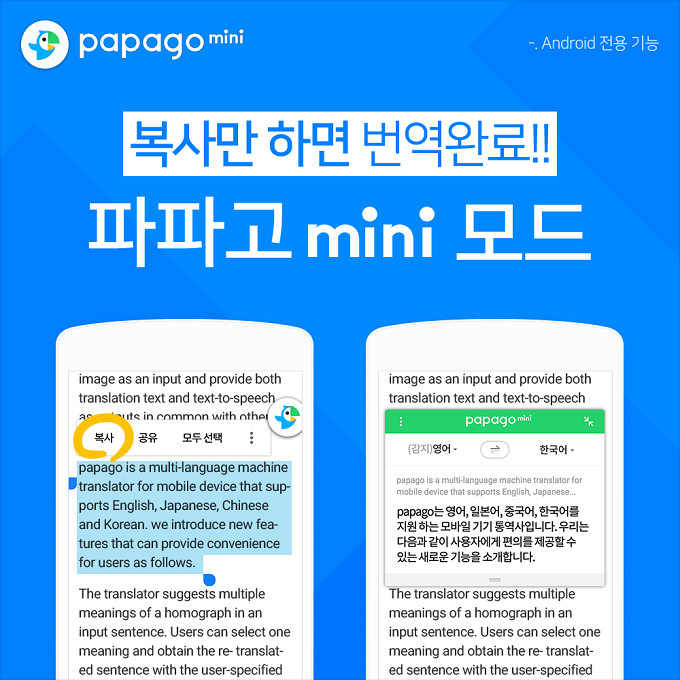 네이버는 인공지능 기술 기반 자동통역 앱 ‘파파고(papago)’ 업데이트를 통해 모바일 브라우저에서 텍스트를 바로 번역해주는 ‘미니(mini)’ 기능을 선보였다.