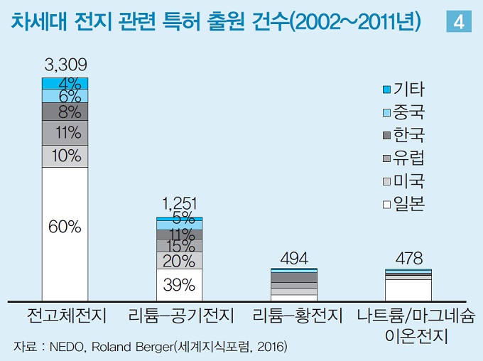 LG경제연구원이 발표한 '차세대 2차전지' 보고서에 따르면, 업계의 글로벌 특허 출원건수도 전고체전지 관련 출원이 다른 차세대 전지후보 기술들보다 압도적으로 많다. 2002~2011년 차세대 전지 관련 특허출원건수를 보면, 전고체전지의 특허출원건수는 3309건으로 두번째로 많은 리튬-공기전지의 1251건보다 3배 가까이 높은 수치를 보이고 있다. 특히 일본이 특허출원국가 중 60%를 차지할 정도로 가장 적극적이다.