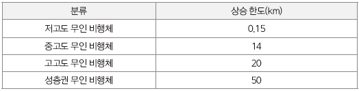 또한 운용고도에 의한 분류는 저고도(150m)에서 성층권(50km)까지 4단계로 분류되어 있다. 항공법에서는 저고도인 150m까지만 비행할 수 있도록 되어 있다.