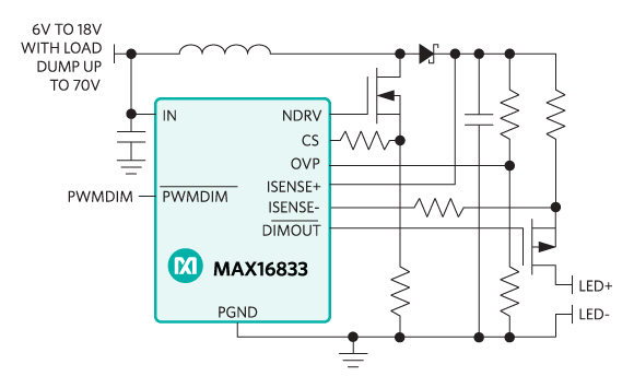 맥심 HB LED 드라이버 MAX16833 제품군은 스프레드 스펙트럼을 위한 주파수 디더링으로 EMI 제어 성능을 높여 준다. 이 제품군은 하이빔, 로우빔, 시그널 조명, 주간주행등, 안개등, 적응형전조등(AFLS)과 같은 다양한 차량용 조명 애플리케이션에 적합하다.