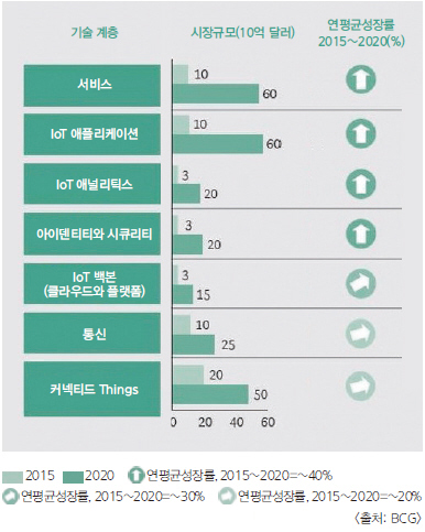▲ 그림 2. IoT 기술 계층별 시장규모 및 성장률