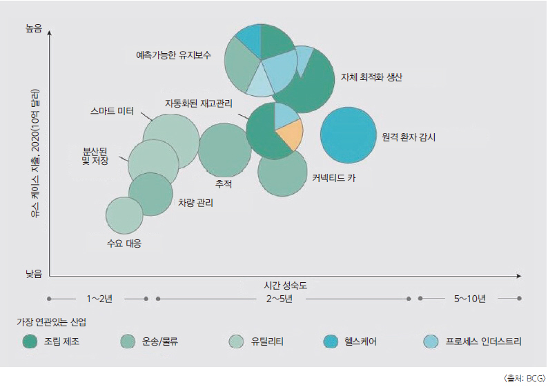 보고서에 따르면, 예측 유지 보수, 자체 최적화 생산 및 자동 재고 관리는 2020년까지 IoT 시장 성장을 주도하는 3대 활용 사례다. 비즈니스 리더는 IoT를 통해 기업의 고객 만족도 향상, 품질 향상, 새로운 비즈니스 모델 지원 및 비용 절감이 되는지 묻는다. 이에 따라 BCG는 유스 케이스에 대한 광범위한 분석을 완료했다. 10가지 가장 유용한 사례는 ▲센서 기반 기계 수리 예측 ▲자동 최적화 생산 ▲자동 재고 관리 ▲원격 환자 모니터링 ▲스마트 미터 ▲추적 및 추적 ▲커넥티드 카 ▲분산 발전 및 스토리지 ▲차량 관리 ▲수요 대응 등이다. 그림 3은 분석된 10개의 유스 케이스를 예상 지출과 성숙 기간별로 비교한 것이다.