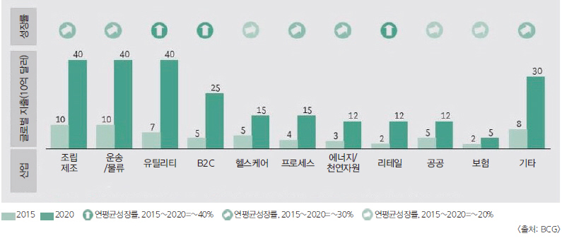 BCG는 2020년까지 IoT 기술, 제품 및 서비스의 시장규모가 2,670억 달러에 이를 것으로 예측했는데, 이러한 성장 원인은 서비스 및 IoT 애플리케이션 투자 때문이라고 분석했다.