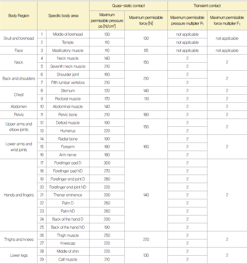 네 번째 Power and force limiting by inherent design or control 모드에서 상해 발생이 방지되는 접촉 힘이나 압력, 즉 인간-로봇 충돌 시 협동로봇이 준수해야 하는 임계값은 ISO TS 15066의 부속서에 제시되어 있다[표 1].