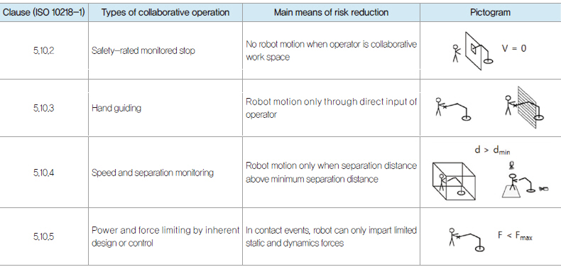 ISO TS 15066 (또는 ISO 10218-1)에서는 협동 작업을 그림 1과 같이 네 가지 모드로 구분하고 있으며, 이중 한 가지 이상의 작업 모드 수행이 가능한 로봇을 협동로봇으로 정의하고 있다. 네 가지 모드는 각각 다음과 같다.