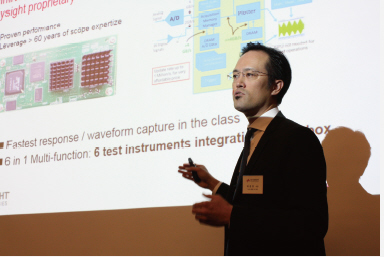 최 사장의 발표 후에는 키사이트의 오실로스코프마켓브랜드 담당 아츠키 오카자키(Atsuki Okazaki) 매니저의 발표가 이뤄졌다. 먼저 아츠키 매니저는 오실로스코프의 필요성을 강조했다. 성능이 설계한대로 나오는지를 보려면 회로에서 지나다니는 정기적인 신호를 보아야 하는데 이는 눈에 보이지 않기 때문에 오실로스코프가 이 역할을 해야 한다는 것. 아츠키 매니저는 “최근 개발 기간이 점점 짧아지고 있고 고객들은 하나의 제품에 다양한 기능이 들어있기를 요구하기 때문에 그만큼 테스트할 부분이 많아졌다”고 말하며 오실로스코프가 현장에서 꼭 필요한 제품이라는 것을 역설했다.