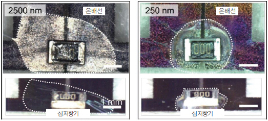▲ 그림 2. 배선 사이에 칩 저항기를 배치하고 SBS 나노 시트로 봉지 모습. (왼쪽: 두께가 2500 nm의 시트,