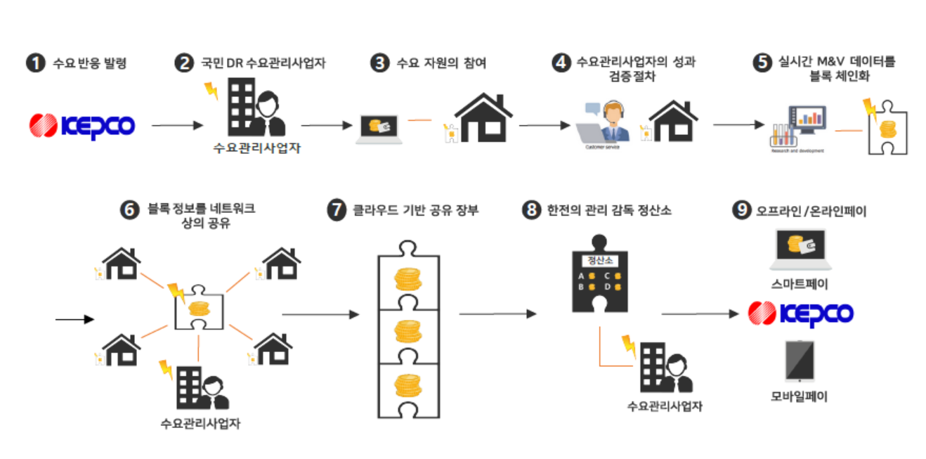 현재 호주에서는 블록체인을 활용해 전력거래를 시험 중이며, 영국과 독일에서도 전기나 가스의 계량을 통한 데이터 관리 시스템을 블록체인 기술 기반으로 제공하고 있다. 한국 정부도 오는 2030년까지 최대 사용전력의 5%를 수요자원으로 대체한다는 계획을 발표한 바 있다. 에너지 블록체인은 성장하는 전력 수요 시장에 에너지 신 서비스 비즈 모델을 개발하는 기반 기술로서 활용될 것으로 기대한다.