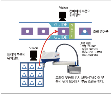 때에 따라서는 각각의 위치에서 부품 공급 측의 부품이 일정 위치로 공급되지 못한 때도 있다. 이 경우 원하는 위치의 제품을 비전시스템으로 검사하고 정확한 X, Y, 각도 정보를 로봇으로 보내서 로봇은 이를 보정한 위치로 이동시킴으로써 부품의 정확한 조립이 가능해진다.
