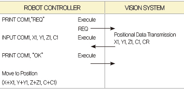 여기서 비전 시스템은 2가지 방법으로 데이터를 보낼 수 있다. 로봇의 작업 반경을 비전에서 고려해서 절댓값으로 보내는 것과 이미 지정된 위치에 대한 변화량의 오프셋 치만을 증분값으로 연산해서 보내는 방법이 있다. 이것은 작업해야 하는 환경 또는 제품에 따라서 달라지고 비전 데이터에 따라서 로봇의 프로그램 방법이 달라져야 한다. 이 경우 데이터 전송에 사용되는 통신 방법은 RS-232C 또는 Ethernet을 사용하게 되는데, 로봇 제어기의 프로토콜을 맞추어 사용해야 한다.