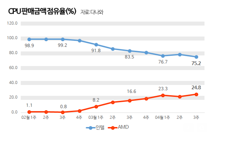 27일 가격비교 사이트 다나와는 4월 3주 CPU판매 시장에서 AMD의 판매금액 점유율이 24.8%를 기록했다고 밝혔다. 이는 ‘라이젠’ 출시 직전인 2월 3주 점유율0.8%에서 24% 상승한 수치다. 같은 기간 판매량 점유율은 1.5%에서 16%로 뛰어올랐다.